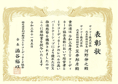 2021年11月 ITコーディネーター協会表彰 ~DX認定企業の輩出を目指して~ において「ITC協会奨励賞」を頂きました。